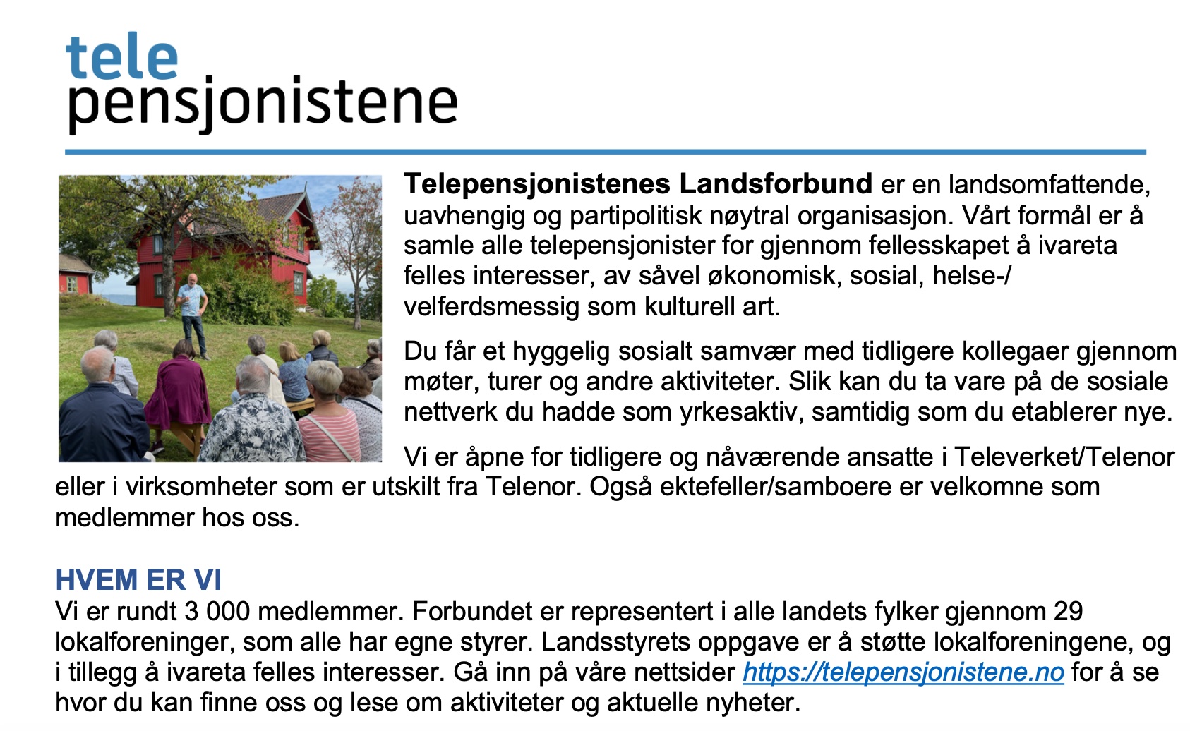 Følg oss på Facebook Klikk her for å gå til vår facebookgruppe. Facebookgruppen er primært rettet mot medlemmene av Telepensjonistenes Landsforbund, men vi ønsker også kontakt med andre tidligere og nåværende ansatte og andre med tilknytning til Televerket/Telenorsystemet.